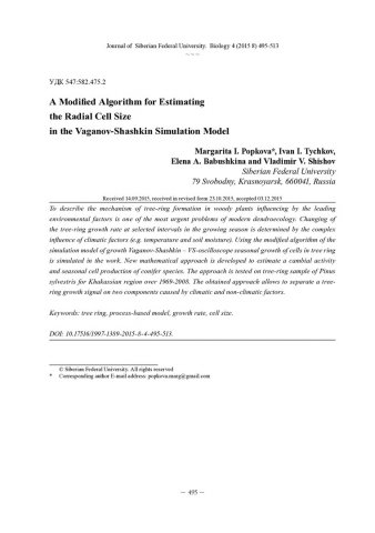 Библиографическое описание:Модифицированный алгоритм оценки радиальных размеров клеток в имитационной модели Ваганова-Шашкина = A Modified Algorithm for Estimating the Radial Cell Size in the Vaganov-Shashkin Simulation Model / М. И. Попкова [и др.]. - Текст : непосредственный // Журнал Сибирского федерального университета. Биология. - 2015. - Т. 8, № 4. - С. 495-513 : ил., табл. - Библиогр.: с. 512-513. - ISSN 1997-1389.