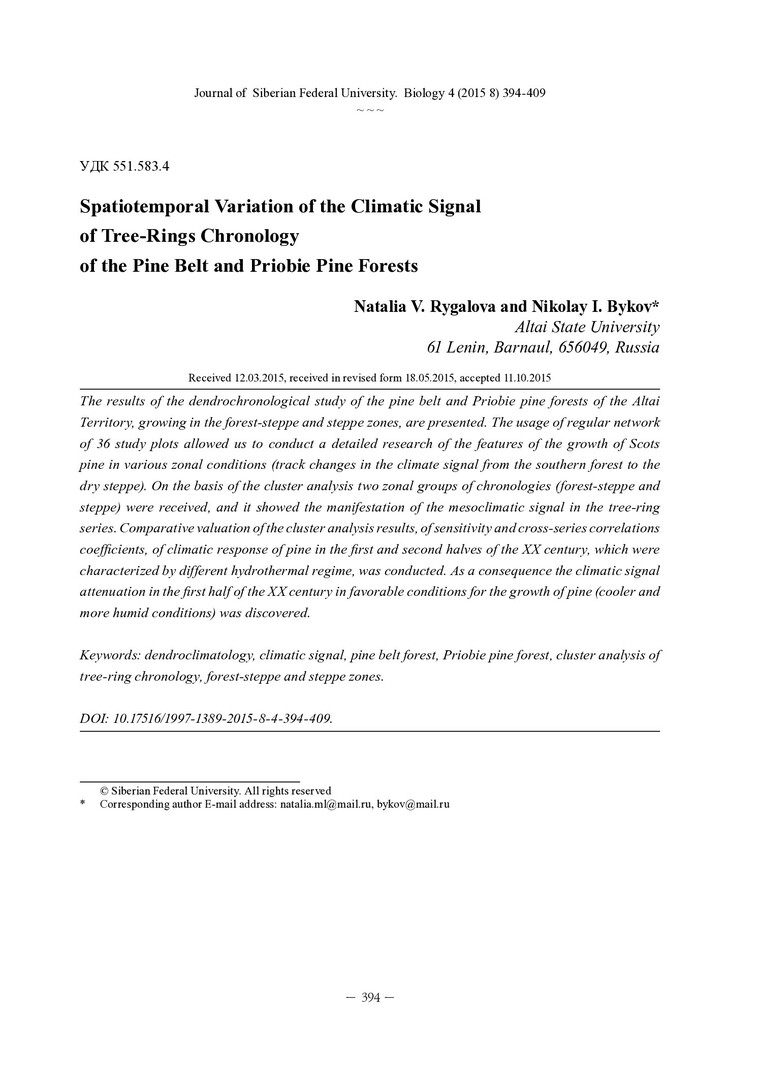 Библиографическое описание:Рыгалова, Н. В. Пространственно-временная изменчивость климатического сигнала древесно-кольцевых хронологий ленточных и Приобских боров = Spatiotemporal Variation of the Climatic Signal of Tree-Rings Chronology of the Pine Belt and Priobie Pine Forests / Н. В. Рыгалова, Н. И. Быков. - Текст : непосредственный // Журнал Сибирского федерального университета. Биология. - 2015. - Т. 8, № 4. - С. 394-409 : ил., табл. - Библиогр.: с. 406-409. - ISSN 1997-1389.