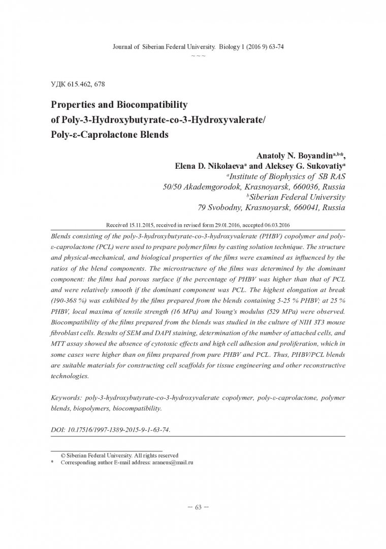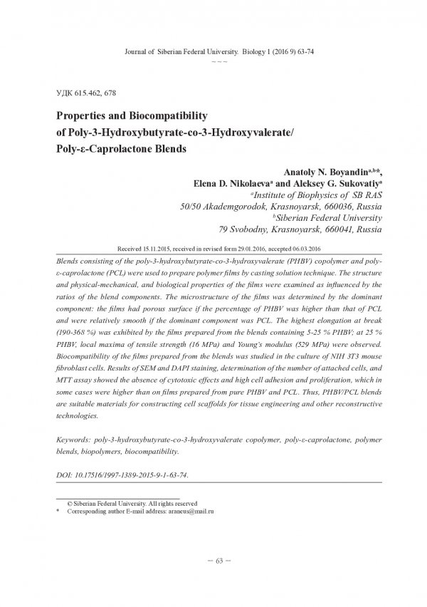 Библиографическое описание:Boyandin, A. N. Properties and Biocompatibility of Poly-3-Hydroxybutyrate-co-3-Hydroxyvalerate/ Poly-э?псилон-Caprolactone Blends = Свойства и биосовместимость смесей поли-3-гидроксибутирата-3-гидроксивалерата с поли- э?псилон-капролактоном / A. N. Boyandin, E. D. Nikolaeva, A. G. Sukovatiy. - Текст : непосредственный // Журнал Сибирского федерального университета. Биология. - 2016. - Т. 9, № 1. - С. 63-74 : табл., ил. - Библиогр.: с. 73-74. - ISSN 1997-1389.