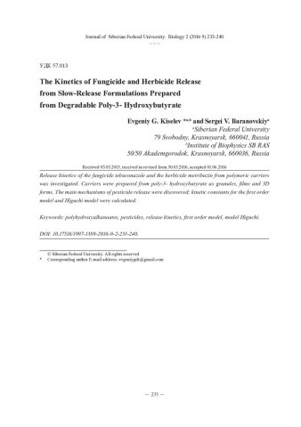 Библиографическое описание:Киселев, Е. Г. Кинетика выхода препаратов фунгицидного и гербицидного действия из пролонгированных форм, полученных из разрушаемого поли-3-гидроксибутирата = The Kinetics of Fungicide and Herbicide Release from Slow-Release Formulations Prepared from Degradable Poly-3- Hydroxybutyrate / Е. Г. Киселев, С. В. Барановский. - Текст : непосредственный // Журнал Сибирского федерального университета. Биология. - 2016. - Т. 9, № 2. - С. 233-240 : табл. - Библиогр.: с. 239-240. - ISSN 1997-1389.