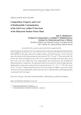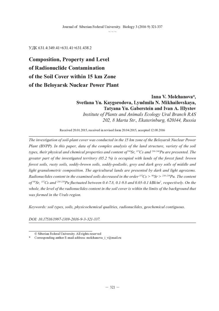 Библиографическое описание: Состав, свойства и уровень радионуклидного загрязнения почвенного покрова 15-километровой зоны Белоярской АЭС = Composition, Property and Level of Radionuclide Contamination of the Soil Cover within 15 km Zone of the Beloyarsk Nuclear Power Plant / И. В. Молчанова [и др.]. - Текст : непосредственный // Журнал Сибирского федерального университета. Биология. - 2016. - Т. 9, № 3. - С. 321-337 : ил., табл. - Библиогр.: с. 335-337. - ISSN 1997-1389.