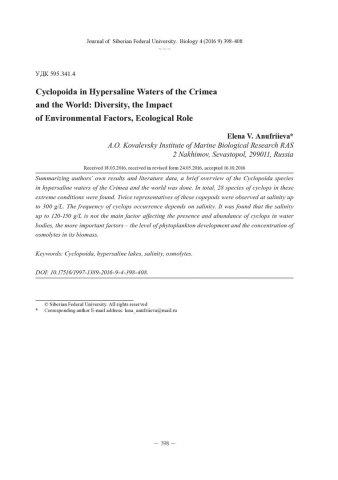 Библиографическое описание:Ануфриева, Е. В. Cyclopoida в гиперсоленых водоемах Крыма и мира: разнообразие, влияние факторов среды, экологическая роль / Е. В. Ануфриева = Cyclopoida in Hypersaline Waters of the Crimea and the World: Diversity, the Impact of Environmental Factors, Ecological Role. - Текст : непосредственный // Журнал Сибирского федерального университета. Биология. - 2016. - Т. 9, № 4. -С. 398-408 : табл. - Библиогр.: с. 405-408. - ISSN 1997-1389.