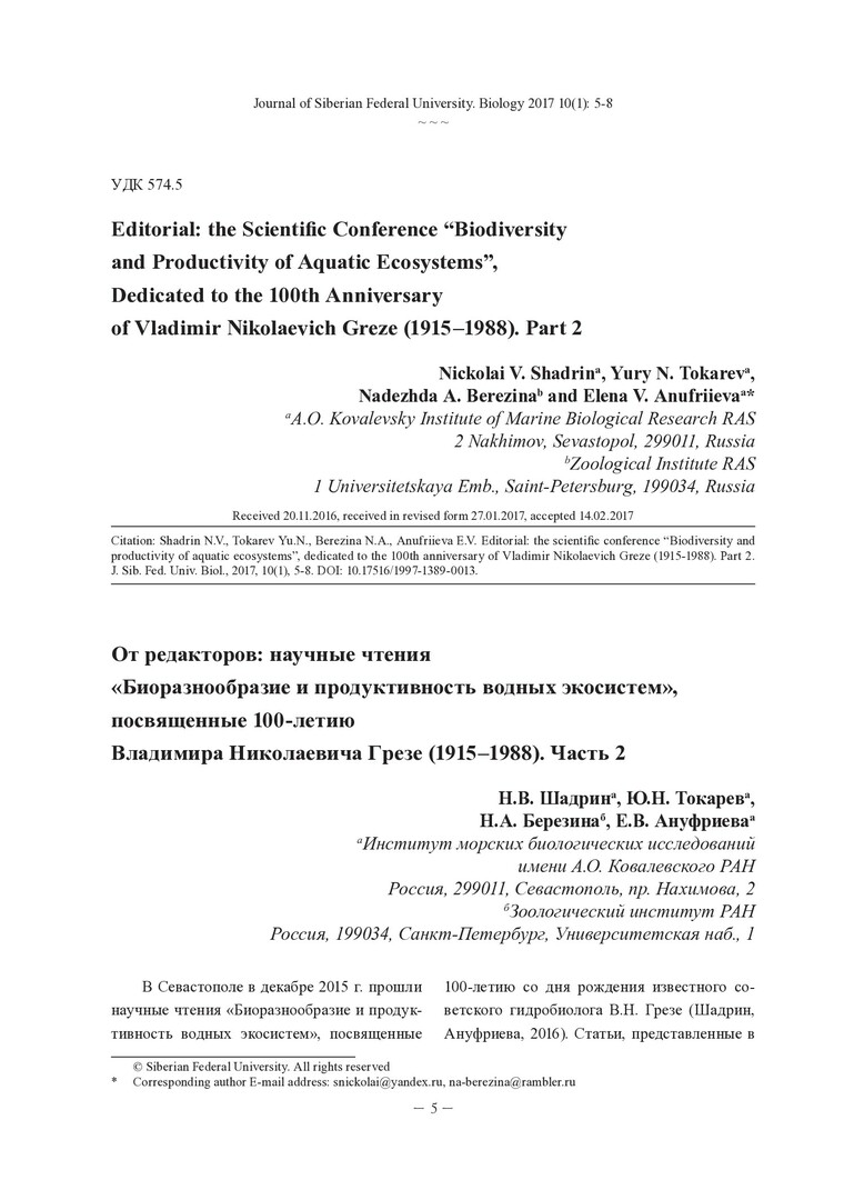 Библиографическое описание:От редакторов: Научные чтения "Биоразнообразие и продуктивность водных экосистем", посвященные 100-летию Владимира Николаевича Грезе (1915-1988) = Editorial: the Scientific Сonference "Biodiversity and Productivity of Aquatic Ecosystems", Dedicated to the 100th Anniversary of Vladimir Nikolaevich Greze (1915-1988). Ч. 2 ; Pt. 2 / Н. В. Шадрин [и др.]. - Текст : непосредственный // Журнал Сибирского федерального университета. Биология. - 2017. - Т. 10, № 1. - С. 5-8. - Библиогр.: с. 7-8. - ISSN 1997-1389.