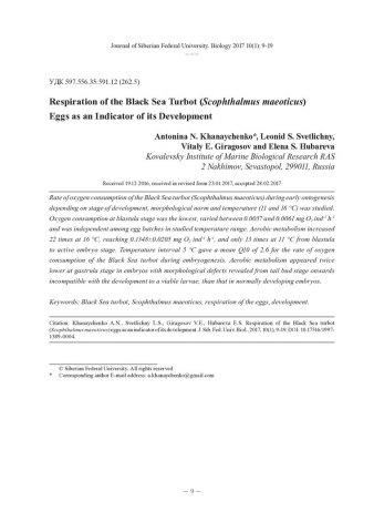 Библиографическое описание:Дыхание икры черноморского калкана (Scophthalmus maeoticus) как показатель ее развития = Respiration of the Black Sea Turbot (Scophthalmus maeoticus) Eggs as an Indicator of its Development / А. Н. Ханайченко [и др.]. - Текст : непосредственный // Журнал Сибирского федерального университета. Биология. - 2017. - Т. 10, № 1. - С. 9-19 : ил. - Библиогр.: с. 18-19. - ISSN 1997-1389.