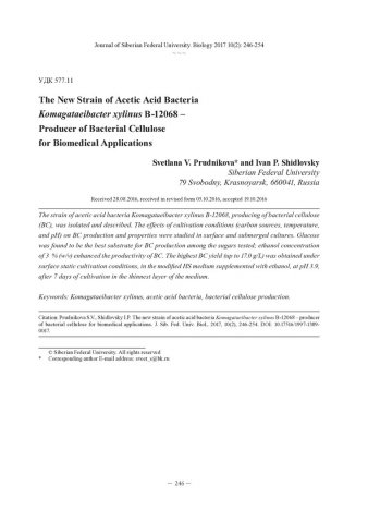 Библиографическое описание:Prudnikova, S. V. The New Strain of Acetic Acid Bacteria Komagataeibacter xylinus B-12068 – Producer of Bacterial Cellulose for Biomedical Applications = Новый штамм уксуснокислых бактерий Komagataeibacter xylinus B-12068 – продуцент бактериальной целлюлозы для биомедицинского применения / S. V. Prudnikova, I. P. Shidlovsky. - Текст : непосредственный // Журнал Сибирского федерального университета. Биология. - 2017. - Т. 10, № 2. - С. 246-254 : табл. - Библиогр.: с. 252-254. - ISSN 1997-1389.