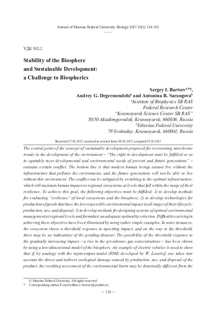 Библиографическое описание:Bartsev, S. I. Stability of the Biosphere and Sustainable Development: a Challenge to Biospherics = Стабильность биосферы и устойчивое развитие: вызов биосферике / S. I. Bartsev, A. G. Degermendzhi, A. B. Sarangova. - Текст : непосредственный // Журнал Сибирского федерального университета. Биология. - 2017. - Т. 10, № 2. - С. 134-152 : ил. - Библиогр.: с. 151-152. - ISSN 1997-1389.