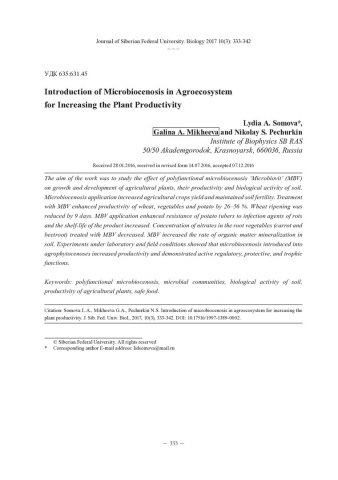 Библиографическое описание:Somova, L. A. Introduction of Microbiocenosis in Agroecosystem for Increasing the Plant Productivity = Интродукция микробиоценоза в агроэкосистемы для увеличения продуктивности растений / L. A. Somova, G. A. Mikheeva, N. S. Pechurkin. - Текст : непосредственный // Журнал Сибирского федерального университета. Биология. - 2017. - Т. 10, № 3. - С. 333-342 : ил. - Библиогр.: с. 341-342. - ISSN 1997-1389.