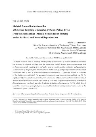 Библиографическое описание:Яблоков, Н. О. Аномалии развития скелета у молоди сибирского хариуса Thymallus arcticus (Pallas, 1776) из р. Мана (система Среднего Енисея) при искусственном и естественном воспроизводстве = Skeletal Anomalies in Juveniles of Siberian Grayling Thymallus arcticus (Pallas, 1776) from the Mana River (Middle Yenisei River System) under Artificial and Natural Reproduction / Н. О. Яблоков. - Текст : непосредственный // Журнал Сибирского федерального университета. Биология. - 2017. - Т. 10, № 3. - С. 343-357 : ил. - Библиогр.: с. 355-357. - ISSN 1997-1389.