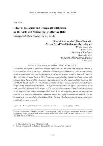 Аннотация:Для изучения влияния предпосевной обработки инокулятом почвенных микроорганизмов на урожай и содержание питательных веществ в семенах Dracocephalum moldavica L. в 2010 году в Центре исследования сельскохозяйственных и природных ресурсов западного Азербайджана (г. Урмия, Иран) был проведен полевой эксперимент, основанный на рандомизированной блочной схеме с четырьмя повторностями.
