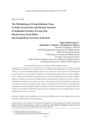 Библиографическое описание:Дубовская, О. П. Методология использования седиментационных ловушек для изучения вертикального потока и скорости осаждения взвешенных частиц большого размера: морского снега, фекальных пеллет и трупов зоопланктона (обзор литературы) = The Methodology of Using Sediment Traps to Study Vertical Flux and Sinking Velocities of Suspended Particles of Large Size: Marine Snow, Fecal Pellets and Zooplankton Carcasses (a Review) / О. П. Дубовская, А. П. Толомеев, Ж. Ф. Бусева. - Текст : непосредственный // Журнал Сибирского федерального университета. Биология. - 2017. - Т. 10, № 3. - С. 269-300 : ил. - Библиогр.: с. 293-300. - ISSN 1997-1389.