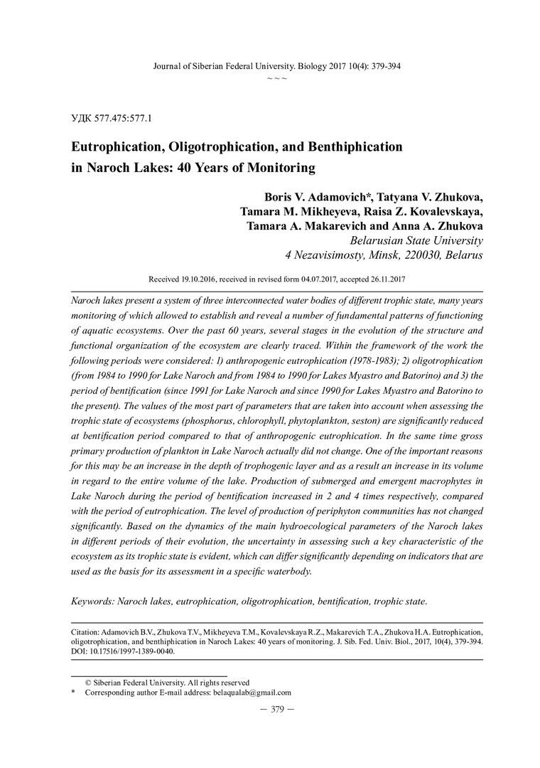 Библиографическое описание:Эвтрофирование, олиготрофикация и бентификация в Нарочанских озерах: 40 лет мониторинговых исследований = Eutrophication, Oligotrophication, and Benthiphication in Naroch Lakes: 40 Years of Monitoring / Б. В. Адамович [и др.]. - Текст : непосредственный // Журнал Сибирского федерального университета. Биология. - 2017. - Т. 10, № 4. - С. 379-394 : ил., табл. - Библиогр.: с. 391-394. - ISSN 1997-1389.