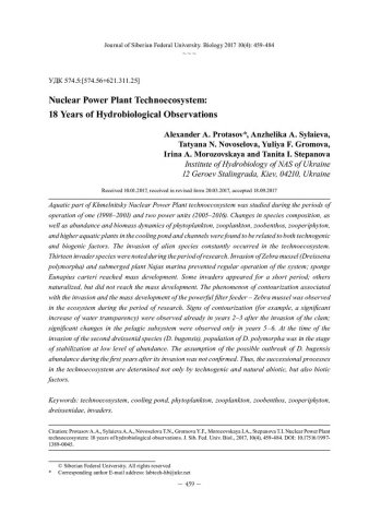 Аннотация:Водную часть техноэкосистемы Хмельницкой АЭС исследовали при функционировании одного (1998–2001 гг. ) и двух энергоблоков (2005–2016 гг. ). Исследования фитопланктона, зоопланктона, зообентоса, зооперифитона, высших водных растений в водоеме-охладителе и каналах показали, что во всех подсистемах происходили изменения состава и показателей количественного развития, связанные как с техногенными, так и c биотическими факторами. В техноэкосистеме постоянно происходил инвазийный процесс. За период исследований отмечено 13 видов гидробионтов-инвайдеров. Вселение моллюсков дрейссенид (Dreissena рolymorpha, затем D. bugensis), а также погруженных растений Najas marina привело к возникновению биопомех, массового развития достигла губка Eunapius carteri. Некоторые инвайдеры встречались непродолжительное время, другие натурализовались, но не достигали массового развития. За период исследований в экосистеме наблюдалось явление контуризации, связанное с вселением и массовым развитием мощного фильтратора – дрейссены (D. рolymorpha).