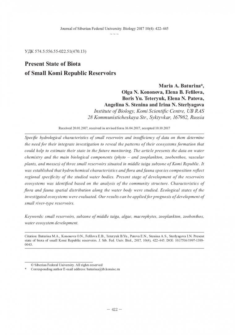 Библиографическое описание:Современное состояние биоты малых водохранилищ Республики Коми = Present State of Biota of Small Komi Republic Reservoirs / М. А. Батурина [и др.]. - Текст : непосредственный // Журнал Сибирского федерального университета. Биология. - 2017. - Т. 10, № 4. - С. 422-445 : табл., ил. - Библиогр.: с. 441-445. - ISSN 1997-1389.