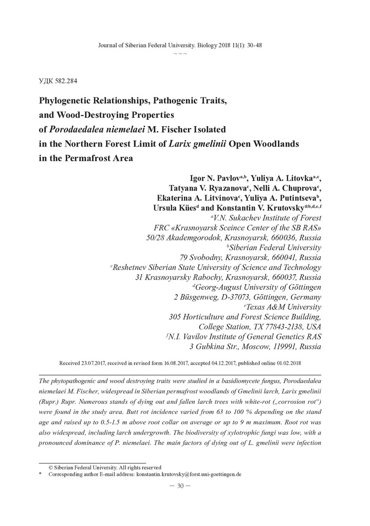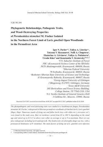 Библиографическое описание:Phylogenetic Relationships, Pathogenic Traits, and Wood-Destroying Properties of Porodaedalea niemelaei M. Fischer Isolated in the Northern Forest Limit of Larix gmelinii Open Woodlands in the Permafrost Area = Патогенные и дереворазрушающие свойства Porodaedalea niemelaei M. Fischer в редколесьях Larix gmelinii в районах вечной мерзлоты / I. N. Pavlov [и др.]. - Текст : непосредственный // Журнал Сибирского федерального университета. Биология. - 2018. - Т. 11, № 1. - С. 30-48 : ил., табл. - Библиогр.: с. 46-48. - ISSN 1997-1389.