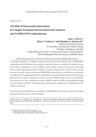 Аннотация:Методом молекулярного докинга исследован возможный механизм формирования белкового комплекса между бактериальной люциферазой и NADPH: FMN-оксидоредуктазой из Vibrio harveyi за счет электростатических взаимодействий. Комплекс между исследуемыми ферментами необходим для передачи люциферазе субстрата – молекулы FMNH[2], которая подвержена быстрому автоокислению с образованием активных форм кислорода при контакте с внутриклеточным растворителем. В настоящей работе с помощью метода Монте-Карло было получено многообразие возможных положений NADPH: FMN-оксидоредуктазы относительно люциферазы с учетом потенциала электростатического поля, создаваемого люциферазой. Показано, что среди структур с наименьшей энергией взаимодействия имеется комплекс, в котором ориентация активных центров обоих ферментов способствует прямой передаче флавина. Высказано предположение о роли водородной связи между Arg291 и Gln197 люциферазы и оксидоредуктазы соответственно в стабилизации комплекса между белками.