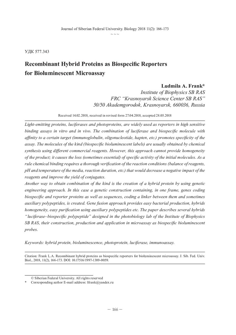 Библиографическое описание: Frank, Ludmila. Recombinant Hybrid Proteins as Biospecific Reporters for Bioluminescent Microassay = Рекомбинантные гибридные белки как биоспецифические репортеры для биолюминесцентного анализа / L. A. Frank. - Текст : непосредственный // Журнал Сибирского федерального университета. Биология. - 2018. - Т. 11, № 2. - С. 166-173 : ил., табл. - Библиогр.: с. 172-173. - ISSN 1997-1389.