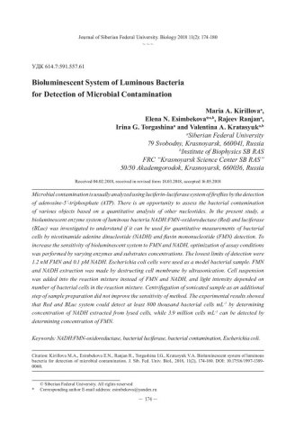 Библиографическое описание:Bioluminescent System of Luminous Bacteria for Detection of Microbial Contamination = Биолюминесцентная система светящихся бактерий для анализа микробного загрязнения / M. A. Kirillova. - Текст : непосредственный // Журнал Сибирского федерального университета. Биология. - 2018. - Т. 11, № 2. - С. 174-180 : ил. - Библиогр.: с. 179-180. - ISSN 1997-1389.