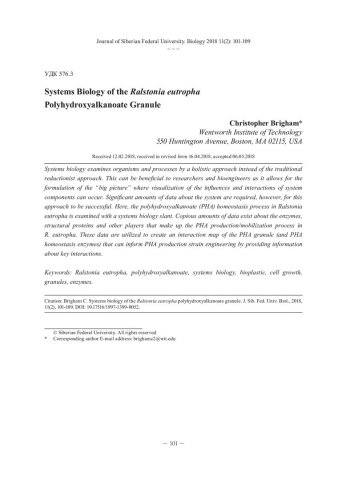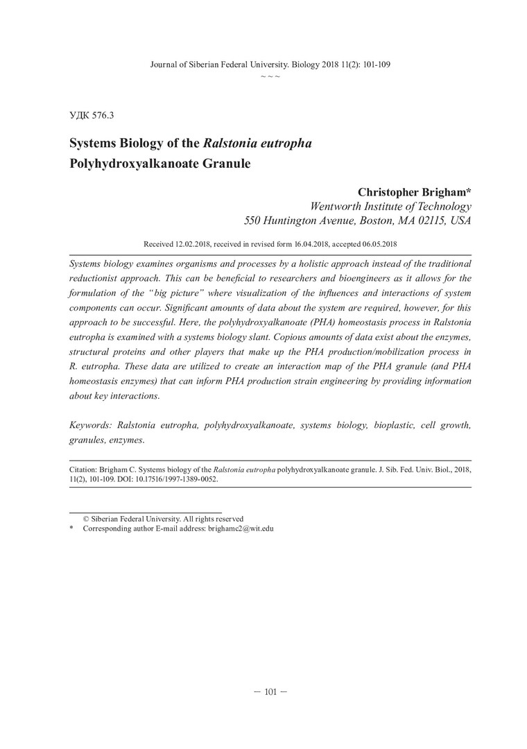 Библиографическое описание:Brigham, Christopher. Systems Biology of the Ralstonia eutropha Polyhydroxyalkanoate Granule = Системная биология полигидроксиалканоатных гранул Ralstonia eutropha / C. Brigham. - Текст : непосредственный // Журнал Сибирского федерального университета. Биология. - 2018. - Т. 11, № 2. - С. 101-109 : табл. - Библиогр.: с. 107-109. - ISSN 1997-1389.