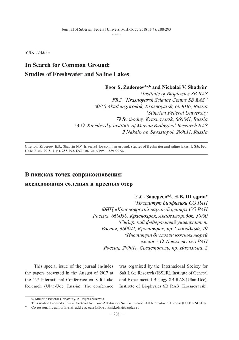 Библиографическое описание:Zadereev, Egor. In Search for Common Ground: Studies of Freshwater and Saline Lakes = В поисках точек соприкосновения: исследования соленых и пресных озер / Е. С. Задереев, Н. В. Шадрин. - Текст : непосредственный // Журнал Сибирского федерального университета. Биология. - 2018. - Т. 11, № 4. - С. 288-293. - Библиогр.: с. 292-293. - ISSN 1997-1389.