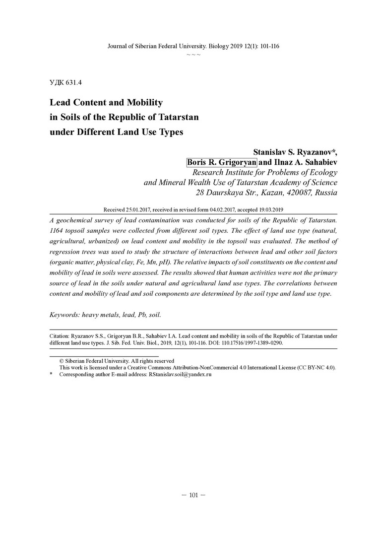 Библиографическое описание:Рязанов, Станислав Сергеевич. Содержание и подвижность свинца в почвах Республики Татарстан в условиях различных типов землепользования = Lead Content and Mobility in Soils of the Republic of Tatarstan under Different Land Use Types / С. С. Рязанов, Б. Р. Григорьян, И. А. Сахабиев. - Текст : непосредственный // Журнал Сибирского федерального университета. Биология. - 2019. - Т. 12, № 1. - С. 101-116 : табл. рис. - Библиогр.: с. 114-116. - ISSN 1997-1389.