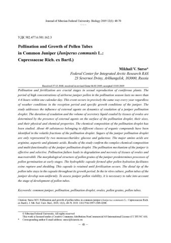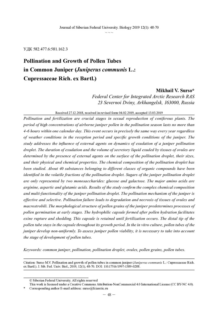 Библиографическое описание: Сурсо, Михаил Вольдемарович. Опыление и рост пыльцевых трубок у можжевельника обыкновенного (Juniperus Communis L.: Cupressaceae Rich. Ex Bartl.) = Pollination and Growth of Pollen Tubes in Common Juniper (Juniperus communis L.: Cupressaceae Rich. ex Bartl.) / М. В. Сурсо. - Текст : непосредственный // Журнал Сибирского федерального университета. Биология. - 2019. - Т. 12, № 1. - С. 48-70 : рис., табл. - Библиогр.: с. 67-70. - ISSN 1997-1389.
