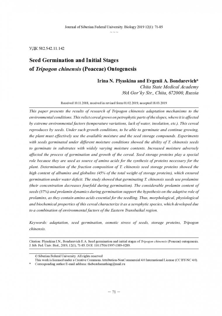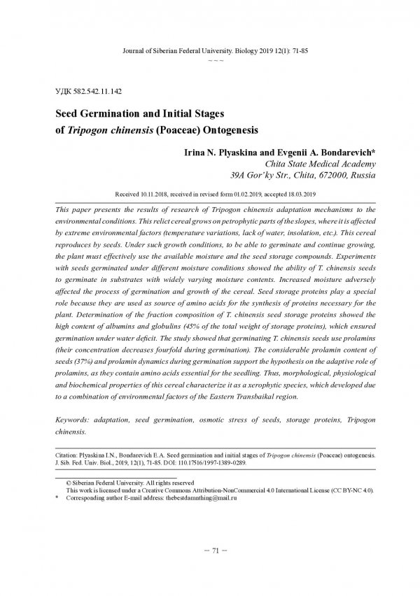 Библиографическое описание: Пляскина, И. Н. Прорастание семян и начальные этапы онтогенеза Tripogon Chinensis (Poaceae) = Seed Germination and Initial Stages of Tripogon chinensis (Poaceae) Ontogenesis / И. Н. Пляскина, Е. А. Бондаревич. - Текст : непосредственный // Журнал Сибирского федерального университета. Биология. - 2019. - Т. 12, № 1. - С. 71-85 : рис. - Библиогр.: с. 81-85. - ISSN 1997-1389.