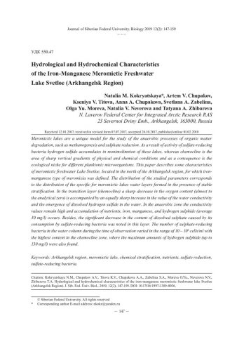 Библиографическое описание:Кокрятская, Наталья Михайловна. Гидролого-гидрохимические характеристики меромиктического железо-марганцевого пресноводного озера Светлое (Архангельская область) = Hydrological and Hydrochemical Characteristics of the Iron-Manganese Meromictic Freshwater Lake Svetloe (Arkhangelsk Region) / Н. М. Кокрятская, А. В. Чупаков [и др.]. - Текст : непосредственный // Журнал Сибирского федерального университета. Биология. - 2019. - Т. 12, № 2. - С. 147-159 : рис., табл. - Библиогр.: с. 157-159. - ISSN 1997-1389.