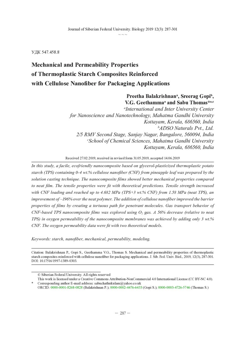 Библиографическое описание: Mechanical and Permeability Properties of Thermoplastic Starch Composites Reinforced with Cellulose Nanofiber for Packaging Applications = Механические свойства и проницаемость термопластичных крахмальных композитов, армированных нановолокнами целлюлозы, для применения в качестве упаковки / P. Balakrishnan [и др.]. - Текст : непосредственный // Журнал Сибирского федерального университета. Биология. - 2019. - Т. 12, № 3. - С. 287-301 : рис., табл. - Библиогр.: с. 299-301. - ISSN 1997-1389.