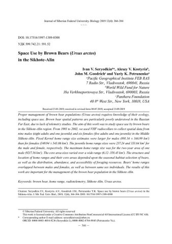 Библиографическое описание: Использование пространства бурыми медведями (Ursus Arctos) на Сихотэ-Алине = Space Use by Brown Bears (Ursus arctos) in the Sikhote-Alin / И. В. Середкин, А. В. Костыря, Д. М. Гудрич, Ю. К. Петруненко. - Текст : непосредственный // Журнал Сибирского федерального университета. Биология. - 2019. - Т. 12, № 4. - С. 366-384 : табл., рис. - Библиогр.: с. 380-384. - ISSN 1997-1389.