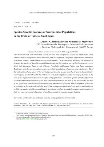 Библиографическое описание: Афанаскина, Л. Н. Видовые особенности нейрон-глиальных популяций головного мозга бесхвостых амфибий = Species-Specific Features of Neuron-Glial Populations in the Brain of Tailless Amphibians / Л. Н. Афанаскина, Н. Н. Медведева. - Текст : непосредственный // Журнал Сибирского федерального университета. Биология. - 2019. - Т. 12, № 4. - С. 445-459 : табл., рис. - Библиогр.: с. 454-459. - ISSN 1997-1389.