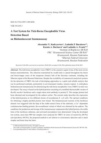 Библиографическое описание:Тест-система для выявления вируса клещевого энцефалита биолюминесцентным иммуноанализом = A Test System for Tick-Borne Encephalitis Virus Detection Based on Bioluminescent Immunoassay / А. Н. Кудрявцев, Л. П. Буракова, К. А. Баринова, Л. А. Франк. - Текст : непосредственный // Журнал Сибирского федерального университета. Биология. - 2020. - Т. 13, № 3. - С. 310-321 : рис., табл. - Библиогр.: с. 320-321. - ISSN 1997-1389.