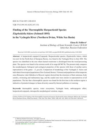 Библиографическое описание: Фефилова, Е. Б. Находка теплолюбивого вида гарпактикоидыe Laphoidella bidens (Schmeil 1893) в р. Вычегда (бассейн Северной Двины Белого моря) = Finding of the Thermophilic Harpacticoid Species Elaphoidella bidens (Schmeil 1893) in the Vychegda River (Northern Dvina, White Sea Basin) / Е. Б. Фефилова. - Текст : непосредственный // Журнал Сибирского федерального университета. Биология. - 2020. - Т. 13, № 4. - С. 443-452 : рис. - Библиогр.: с. 450-452. - ISSN 1997-1389.