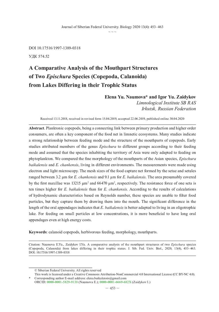 Библиографическое описание:Наумова, Е. Ю. Сравнительный анализ строения ротовых конечностей двух видов рода Epischura (Copepoda, Calanoida) из озер с разным трофическим статусом = A Comparative Analysis of the Mouthpart Structures of Two Epischura Species (Copepoda, Calanoida) from Lakes Differing in their Trophic Status / Е. Ю. Наумова, И. Ю. Зайдыков. - Текст : непосредственный // Журнал Сибирского федерального университета. Биология. - 2020. - Т. 13, № 4. - С. 453-463 : рис., табл. - Библиогр.: с. 461-463. - ISSN 1997-1389.