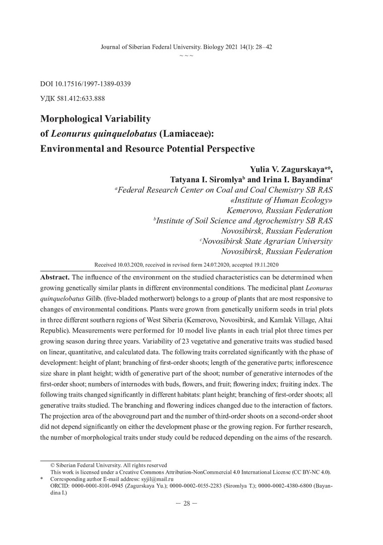 Библиографическое описание: Загурская, Юлия Васильевна. Морфологическая изменчивость Leonurus Quinquelobatus (Lamiaceae): экологическая и сырьевая значимость = Morphological Variability of Leonurus Quinquelobatus (Lamiaceae): Environmental and Resource Potential Perspective / Ю. В. Загурская, Т. И. Сиромля, И. И. Баяндина. - Текст : непосредственный // Журнал Сибирского федерального университета. Биология. - 2021. - Т. 14, № 1. - С. 28-42 : рис., табл. - Библиогр.: с. 39-42. - ISSN 1997-1389.