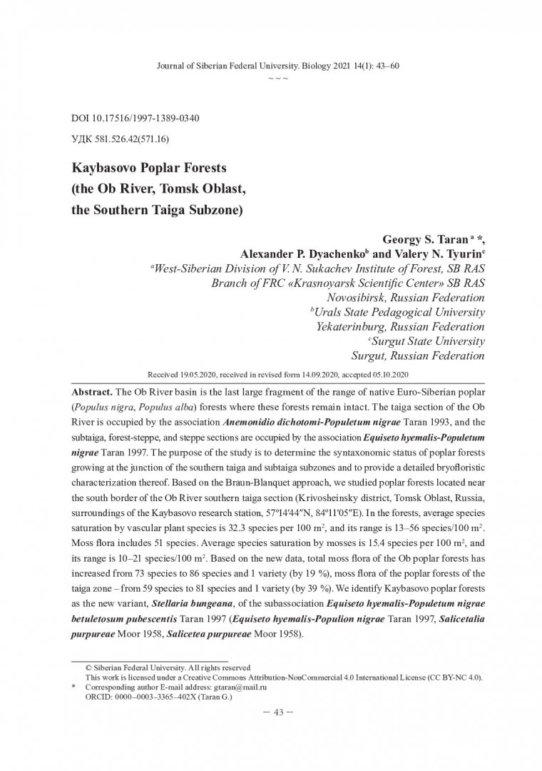 Библиографическое описание:Таран, Георгий Семенович. Кайбасовские тополевые леса (р. Обь, Томская область, подзона южной тайги) = Kaybasovo Poplar Forests (the Ob River, Tomsk Oblast, the Southern Taiga Subzone) / Г. С. Таран, А. П. Дьяченко, В. Н. Тюрин. - Текст : непосредственный // Журнал Сибирского федерального университета. Биология. - 2021. - Т. 14, № 1. - С. 43-60 : табл. - Библиогр.: с. 57-60. - ISSN 1997-1389.