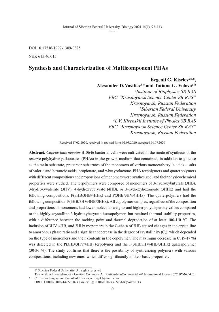 Библиографическое описание: Киселев, Е. Г. Синтез и характеристики многокомпонентных ПГА = Synthesis and Characterization of Multicomponent Phas / Е. Г. Киселев, А. Д. Васильев, Т. Г. Волова. - Текст : непосредственный // Журнал Сибирского федерального университета. Биология. - 2021. - Т. 14, № 1. - С. 97-113 : рис., табл. - Библиогр.: с. 111-113. - ISSN 1997-1389.