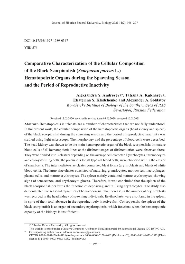 Библиографическое описание:Сравнительная характеристика клеточного состава кроветворных органов морского ерша (Scorpaena porcus L.) в период нереста и функционального покоя = Comparative Characterization of the Cellular Composition of the Black Scorpionfish (Scorpaena porcus L.) Hematopoietic Organs during the Spawning Season and the Period of Reproductive Inactivity / А. Ю. Андреева, Т. А. Кухарева, Е. С. Кладченко, А. А. Солдатов. - Текст : непосредственный // Журнал Сибирского федерального университета. Биология. - 2021. - Т. 14, № 2. - С. 195-207 : рис. - Библиогр.: с. 205-207. - ISSN 1997-1389.