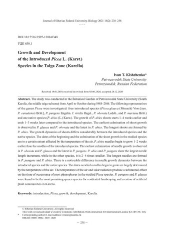 Библиографическое описание:Кищенко, И. Т. Рост и развитие интродуцированных видов Picea L (Karst.) в таежной зоне (Карелия) = Growth and Development of the Introduced Picea L. (Karst.) Species in the Taiga Zone (Karelia) / И. Т. Кищенко. - Текст : непосредственный // Журнал Сибирского федерального университета. Биология. - 2021. - Т. 14, № 2. - С. 238-258 : табл. - Библиогр.: с. 255-258. - ISSN 1997-1389.