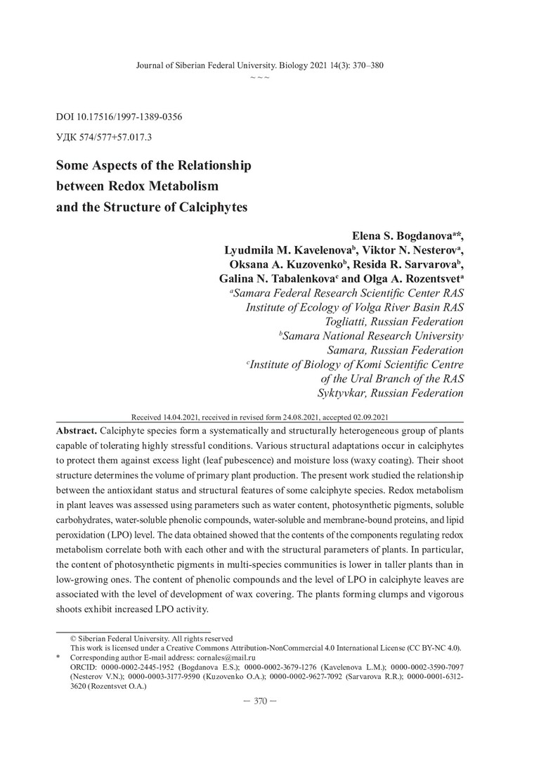Библиографическое описание:Some Aspects of the Relationship between Redox Metabolism and the Structure of Calciphytes = Особенности взаимосвязи редокс-метаболизма и структуры растений кальцефитов / E. S. Bogdanova, L. M. Kavelenova, V. N. Nesterov [et al.]. - Текст : непосредственный // Журнал Сибирского федерального университета. Биология. - 2021. - Т. 14, № 3. - С. 370-380. - Библиогр.: с. 379-380. - ISSN 1997-1389.
