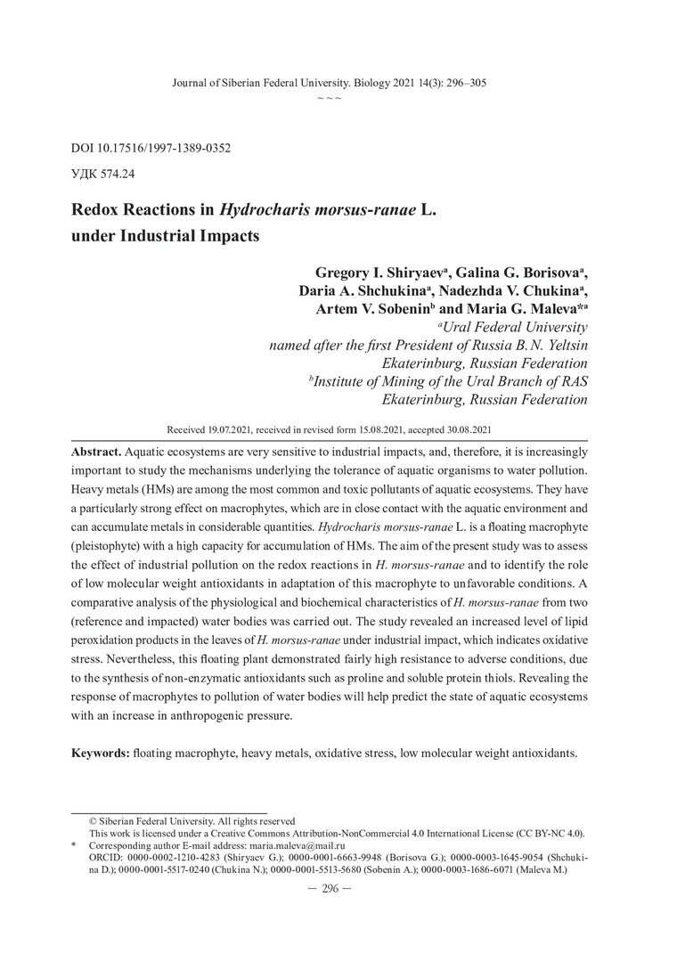 Библиографическое описание:Redox Reactions in Hydrocharis morsus-ranae L. under Industrial Impacts = Редокс-реакции у Hydrocharis morsus-ranae L. в условиях техногенной нагрузки / G. I. Shiryaev, G. G. Borisova, D. A. Shchukina [et al.]. - Текст : непосредственный // Журнал Сибирского федерального университета. Биология. - 2021. - Т. 14, № 3. - С. 296-305. - Библиогр.: с. 304-305. - ISSN 1997-1389.