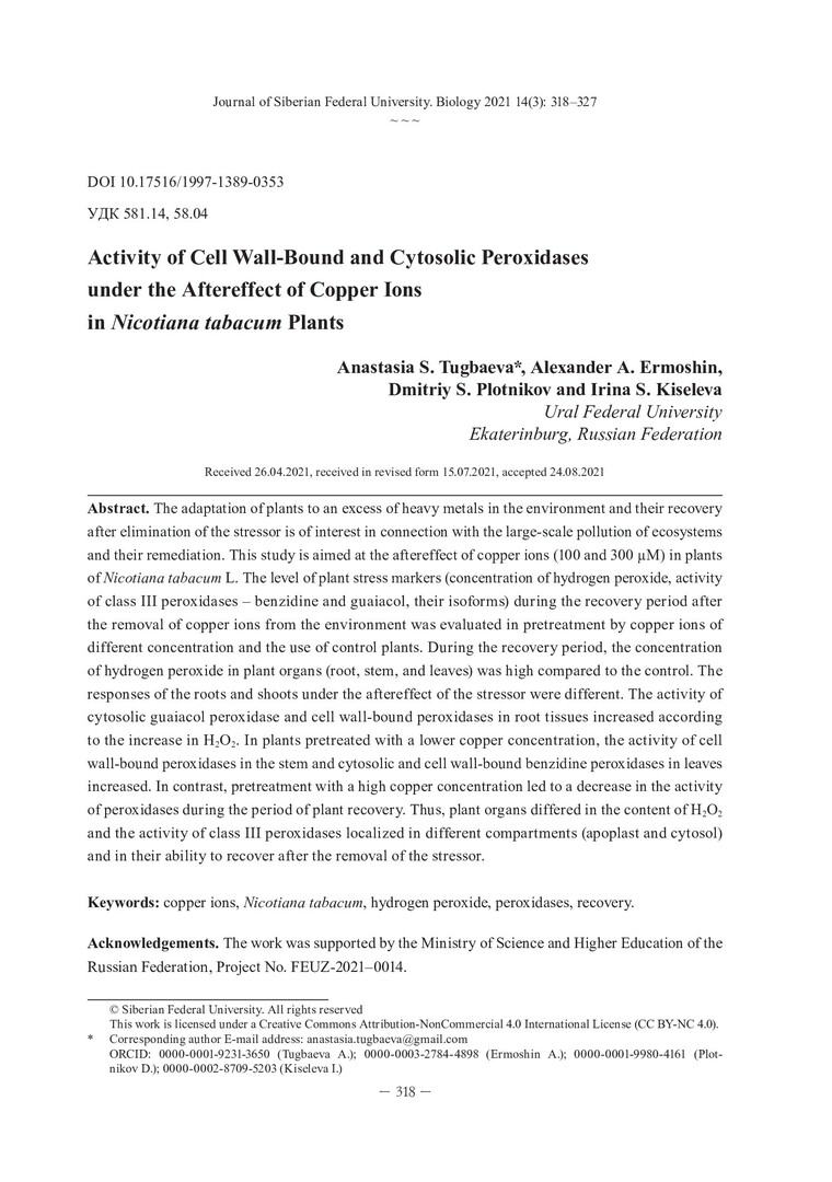 Библиографическое описание:Activity of Cell Wall-Bound and Cytosolic Peroxidases under the Aftereffect of Copper Ions in Nicotiana tabacum Plants = Активность ассоциированных с клеточной стенкой и цитозольных пероксидаз в условиях последействия ионов меди в растениях Nicotiana tabacum / A. S. Tugbaeva, A. A. Ermoshin, D. S. Plotnikov, I. S. Kiseleva. - Текст : непосредственный // Журнал Сибирского федерального университета. Биология. - 2021. - Т. 14, № 3. - С. 318-327 : рис. - Библиогр.: с. 326-327. - ISSN 1997-1389.