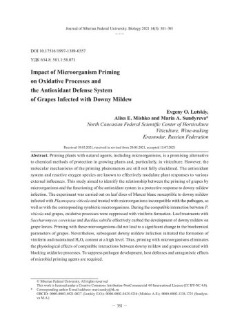 Аннотация:Цель исследования – выявление связи прайминга винограда микроорганизмами и функционирования элементов антиоксидантной системы в защитном ответе на заражение милдью.