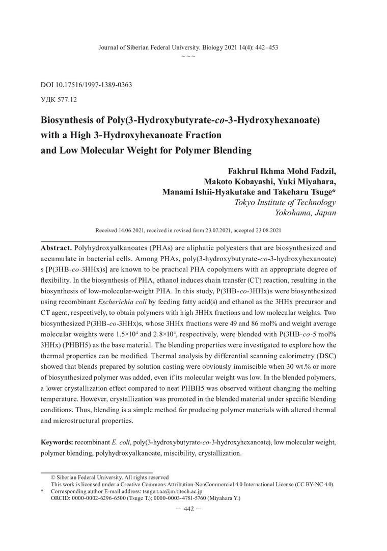 Библиографическое описание: Biosynthesis of Poly(3-Hydroxybutyrate-co-3-Hydroxyhexanoate) with a High 3-Hydroxyhexanoate Fraction and Low Molecular Weight for Polymer Blending = Биосинтез поли(3-гидроксибутирата-со-3-гидроксигексаноата) с высоким содержанием 3-гидроксигексаноата и низкой молекулярной массой для смешения полимеров / F. I. Mohd Fadzil, M. Kobayashi, Yu. Miyahara [et al.]. - Текст : непосредственный // Журнал Сибирского федерального университета. Биология. - 2021. - Т. 14, № 4. - С. 442-453 : 2 рис.; 3 табл. - Библиогр.: с. 450-453. - ISSN 1997-1389.