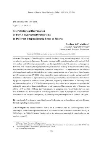 Библиографическое описание: Прудникова, С. В. Микробиологическая деградация пленок из поли(3-гидроксибутирата) в различных почвенно-климатических зонах Сибири = Microbiological Degradation of Poly(3-Hydroxybutyrate) Films in Different Edaphoclimatic Zones of Siberia / С. В. Прудникова. - Текст : непосредственный // Журнал Сибирского федерального университета. Биология. - 2021. - Т. 14, № 4. - С. 533-540 : 2 рис.; 2 табл. - Библиогр.: с. 539-540. - ISSN 1997-1389.