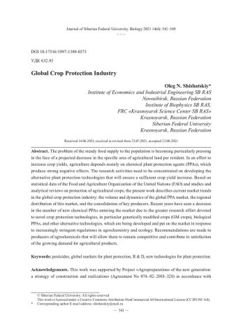 Библиографическое описание: Шишацкий, О. Н. Глобальная индустрия защиты растений = Global Crop Protection Industry / О. Н. Шишацкий. - Текст : непосредственный // Журнал Сибирского федерального университета. Биология. - 2021. - Т. 14, № 4. - С. 541-549 : 3 рис. - Библиогр.: с. 549. - ISSN 1997-1389.