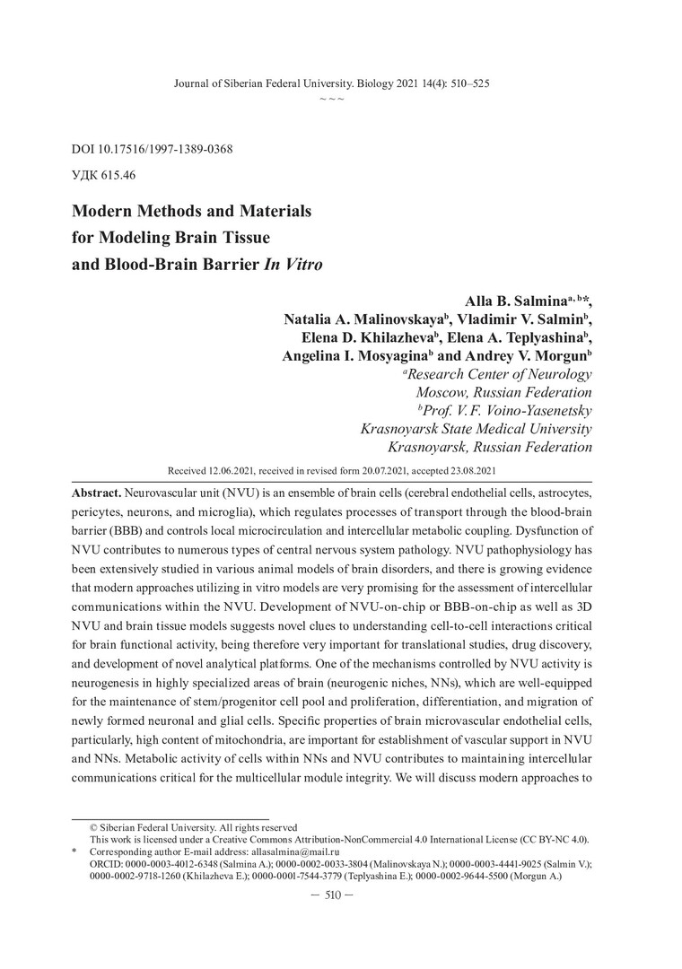 Библиографическое описание: Modern Methods and Materials for Modeling Brain Tissue and Blood-Brain Barrier In Vitro = Современные методы и материалы моделирования тканей мозга и гематоэнцефалического барьера in vitro / A. B. Salmina, N. A. Malinovskaya, V. V. Salmin [et al.]. - Текст : непосредственный // Журнал Сибирского федерального университета. Биология. - 2021. - Т. 14, № 4. - С. 510-525 : 2 рис. - Библиогр.: с. 520-525. - ISSN 1997-1389.