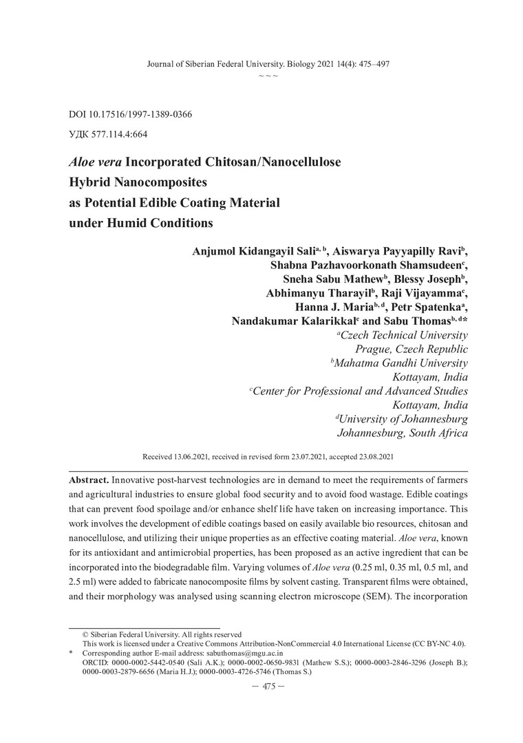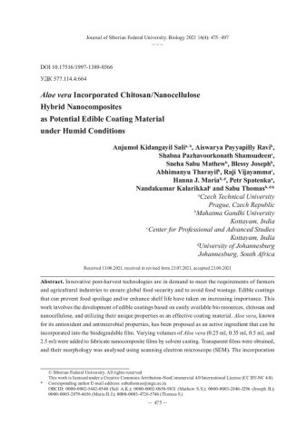 Библиографическое описание: Aloe vera Incorporated Chitosan/Nanocellulose Hybrid Nanocomposites as Potential Edible Coating Material under Humid Conditions = Гибридные нанокомпозиты хитозан/наноцеллюлоза с включением Aloe vera как потенциальный материал для изготовления съедобных покрытий, применяемых в условиях повышенной влажности / A. K. Sali, A. P. Ravi, S. P. Shamsudeen [et al.]. - Текст : непосредственный // Журнал Сибирского федерального университета. Биология. - 2021. - Т. 14, № 4. - С. 475-497 : 16 рис. - Библиогр.: с. 493-497. - ISSN 1997-1389.