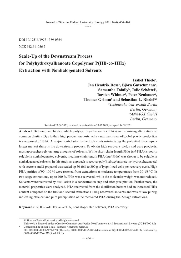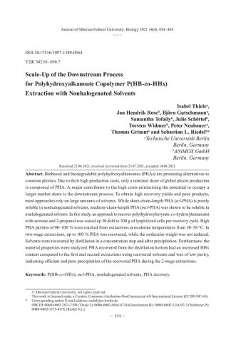 Библиографическое описание: Scale-Up of the Downstream Process for Polyhydroxyalkanoate Copolymer P(HB-co-HHx) Extraction with Nonhalogenated Solvents = Масштабирование процесса экстракции сополимера П(ГБ-co-ГГ) негалогенированными растворителями / I. ThieleI. RoseI. Gutschmann [et al.]. - Текст : непосредственный // Журнал Сибирского федерального университета. Биология. - 2021. - Т. 14, № 4. - С. 454-464 : 3 рис.; 2 табл. - Библиогр.: с. 463-464. - ISSN 1997-1389.