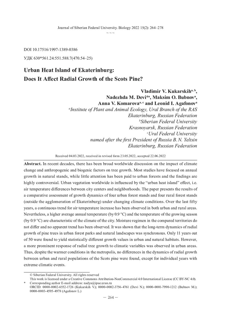 Библиографическое описание: Городской остров тепла г. Екатеринбурга: есть ли влияние на радиальный прирост сосны обыкновенной? = Urban Heat Island of Ekaterinburg: Does It Affect Radial Growth of the Scots Pine? / В. В. Кукарских, Н. М. Дэви, М. О. Бубнов [и др.]. - Текст : непосредственный // Журнал Сибирского федерального университета. Биология. - 2022. - Т. 15, № 2. - С. 264-278 : 5 рис.; 2 табл. - Библиогр.: с. 275-278. - ISSN 1997-1389.
