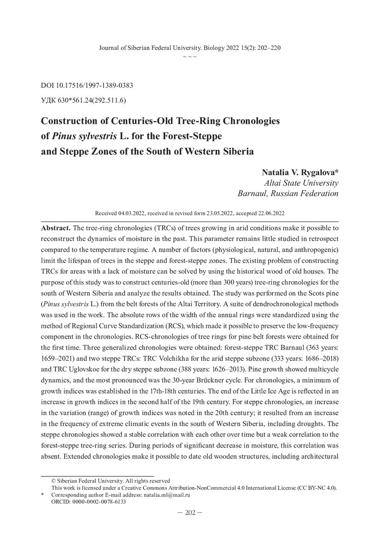 Библиографическое описание: Рыгалова, Н. В. Построение многовековых древесно-кольцевых хронологий Pinus sylvestris L. для лесостепной и степной зон юга Западной Сибири = Construction of Centuries-Old Tree-Ring Chronologies of Pinus sylvestris L. for the Forest-Steppe and Steppe Zones of the South of Western Siberia / Н. В. Рыгалова. - Текст : непосредственный // Журнал Сибирского федерального университета. Биология. - 2022. - Т. 15, № 2. - С. 202-220 : 9 рис.; табл. - Библиогр.: с. 216-220. - ISSN 1997-1389.